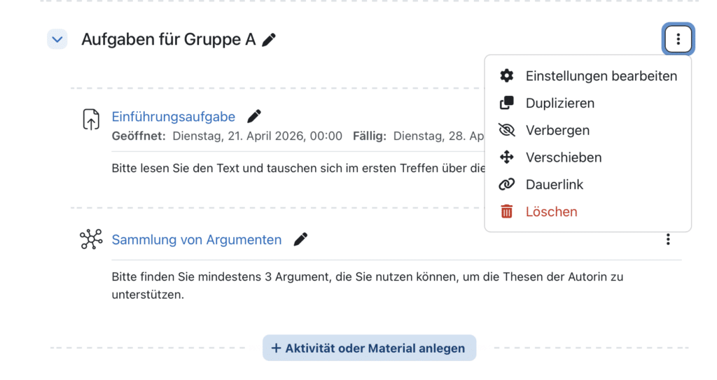 Das Zurücksetzen eines Kurses läuft in großen Kursen nun asynchron im Hintergrund und vermeidet damit Timeouts. Beim Hinzufügen oder Bearbeiten einer Aktivität oder eines Materials springt die Seite automatisch zum neuen Eintrag.