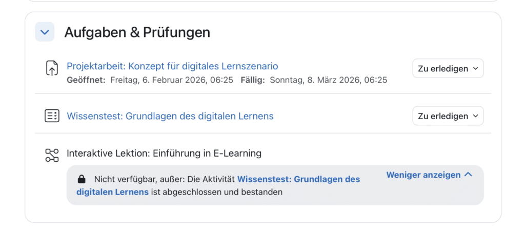 Die Aktivitätsseiten sind in 5.2 optisch und strukturell aufgeräumt. Überflüssige Trennlinien und Leerräume sind entfernt, wichtige Informationen rücken nach oben. Konkret: Aktivitätstermine werden in einem eigenen Bereich über der Beschreibung angezeigt, Abschlussbedingungen stehen direkt unterhalb der Beschreibung – Lernende sehen damit auf einen Blick, was zu tun ist und bis wann.