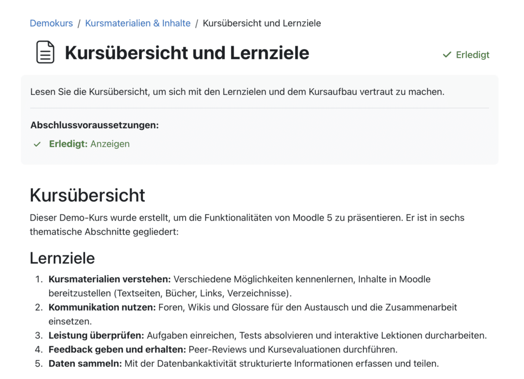 Beim automatischen Aktivitätsabschluss zeigt Moodle nun ein klares Status-Label „Erledigt“. Der Button für den manuellen Abschluss wurde vom Fuß der Aktivität in den Aktivitätsheader verschoben – er ist damit schneller auffindbar.
