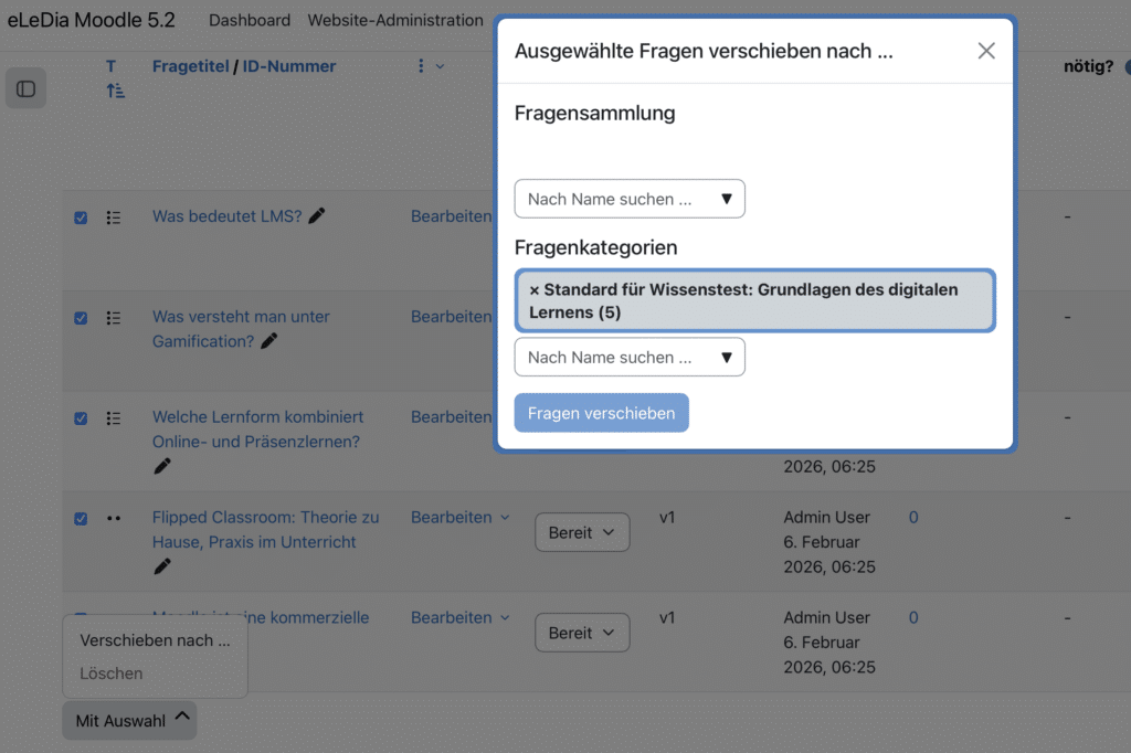 - Ganze Kategorien inklusive aller enthaltenen Fragen und Unterkategorien können zwischen verschiedenen Fragensammlungen verschoben werden.